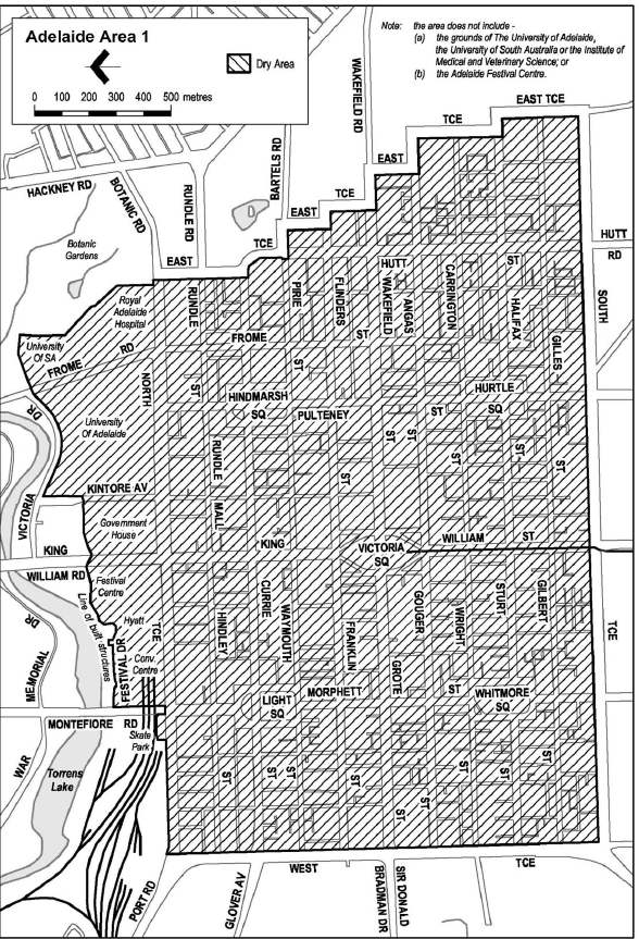 The area in Adelaide bounded as follows: commencing at the point at which the prolongation in a straight line of the eastern boundary of West Terrace intersects the northern boundary of North Terrace, then easterly along that boundary of North Terrace to the western boundary of the Skate Park, then northerly, easterly and southerly around the western, northern and eastern boundaries of the Skate Park to the northern boundary of North Terrace, then easterly along that boundary of North Terrace to the eastern boundary of Montefiore Road, then northerly along that boundary of Montefiore Road to the northernmost boundary of Festival Drive, then easterly along that boundary of Festival Drive to the point at which it meets the northernmost boundary of the built structures comprising and adjacent to the Adelaide Convention Centre Complex, Hyatt Hotel and Adelaide Festival Centre, then generally easterly, northerly and easterly along that boundary to the north-eastern corner of the Adelaide Festival Centre built structures, then in a straight line by the shortest route to the north-western corner of Government House, then easterly along the northern boundary of Government House and the prolongation in a straight line of that boundary to the eastern boundary of Kintore Avenue, then northerly along that boundary of Kintore Avenue to the southern boundary of Victoria Drive, then generally easterly along that boundary of Victoria Drive to the western boundary of Frome Road, then in a straight line by the shortest route to the south-western corner of Botanic Park, then generally easterly along the southern boundary of Botanic Park to the point at which it meets the western boundary of the Botanic Gardens, then generally southerly, south-easterly and southerly along the western boundary of the Botanic Gardens to the northern boundary of North Terrace, then easterly along that boundary of North Terrace to the point at which it meets the northerly prolongation in a straight line of the western boundary of East Terrace, then generally southerly and easterly along that prolongation and the western boundary of East Terrace to the northern boundary of South Terrace, then westerly along that boundary of South Terrace to the eastern boundary of West Terrace, then northerly along that boundary of West Terrace (and the prolongation in a straight line of that boundary) to the point of commencement—