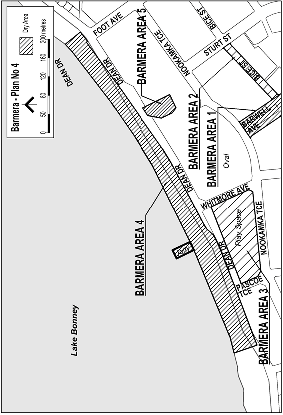 The area in and adjacent to Barmera bounded as follows: commencing at the point at which the prolongation in a straight line of the north-eastern boundary of Foot Avenue intersects the south-eastern waterline of Lake Bonney, then south-easterly along that prolongation to the north-western boundary of Dean Drive, then generally south-westerly along that boundary of Dean Drive to the point at which it meets the north-eastern boundary of the short bitumenised access road (immediately to the north-east of the Lake Bonney Yacht Club car park) that extends at right angles to Dean Drive part of the way to the Lake Bonney waterline (approximately in line with the prolongation in a straight line of the northern end of Laffer Street), then north-westerly along the north-eastern boundary of that bitumenised access road and the prolongation in a straight line of that boundary to the south-eastern waterline of Lake Bonney, then generally north-easterly along that waterline of Lake Bonney to the point of commencement. The area includes the whole of any wharf, jetty, boat ramp or other structure projecting into Lake Bonney from within the area (as well as any area beneath such a structure).