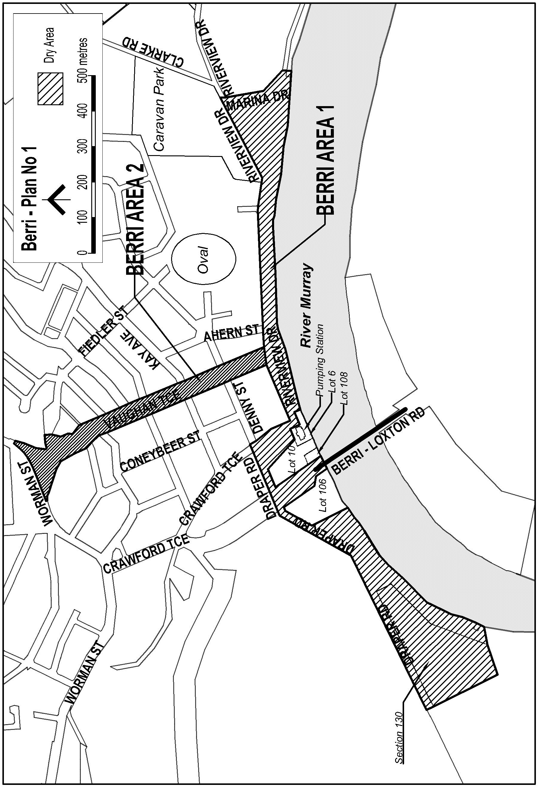 The area in and adjacent to Berri bounded as follows: commencing at the point at which the northern boundary of Riverview Drive is intersected by the prolongation in a straight line of the eastern boundary of Marina Drive, then generally south-easterly along that prolongation and boundary to the point at which the road first turns easterly parallel to the northern bank of the River Murray, then in a straight line by the shortest route to the northern bank of the river, then generally westerly along the northern bank of the river to the point at which the northern bank meets the eastern boundary of Lot 6 DP 44333 (the pumping station), then north-westerly, south-westerly, north-westerly and south-westerly along that boundary of Lot 6 to the eastern boundary of Lot 10 DP 50410, then north-westerly and south-westerly along the boundary of Lot 10 to the western boundary of the Lot, then south-easterly along the western boundary of Lot 10 and of Lot 108 DP 49267 to the northern bank of the River Murray, then south-westerly along that bank of the river to the eastern boundary of Lot 106 DP 49267, then generally north-westerly, south-westerly and south-easterly around the boundary of Lot 106 back to the northern bank of the River Murray, then generally south-westerly along that bank of the river to the point at which the bank is intersected by the prolongation in a straight line of the southern boundary of Section 130 Berri IA, then south-westerly along that prolongation and boundary of Section 130 to the western boundary of the Section, then north-westerly along the western boundary of the Section and the prolongation in a straight line of that boundary to the northern boundary of Draper Road, then generally north-easterly along that boundary of Draper Road and the prolongation in a straight line of that boundary to the eastern boundary of Crawford Terrace, then south-easterly along that boundary of Crawford Terrace to the northern boundary of Riverview Drive, then generally north-easterly, easterly and north-easterly along that northern boundary of Riverview Drive to the point of commencement. The area includes the whole of any wharf, jetty, boat ramp or other structure extending into the River Murray from within the area described above (other than the Berri Bridge south of the northern bank of the river).