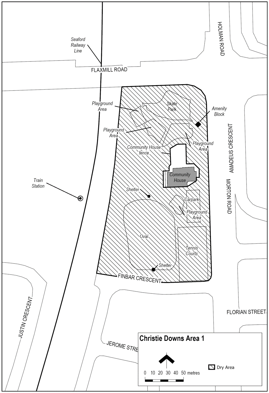 The area in Christie Downs generally known as Niipu-niipu Wama/Morton Park being the area bounded on the north by Flaxmill Road, on the west by the Seaford railway line, on the south by the southern part of the car park continuing east along Finbar Crescent, on the east by Morton Road, excluding the Christie Downs Community House and the associated enclosed outside area as designated by a chain fence.