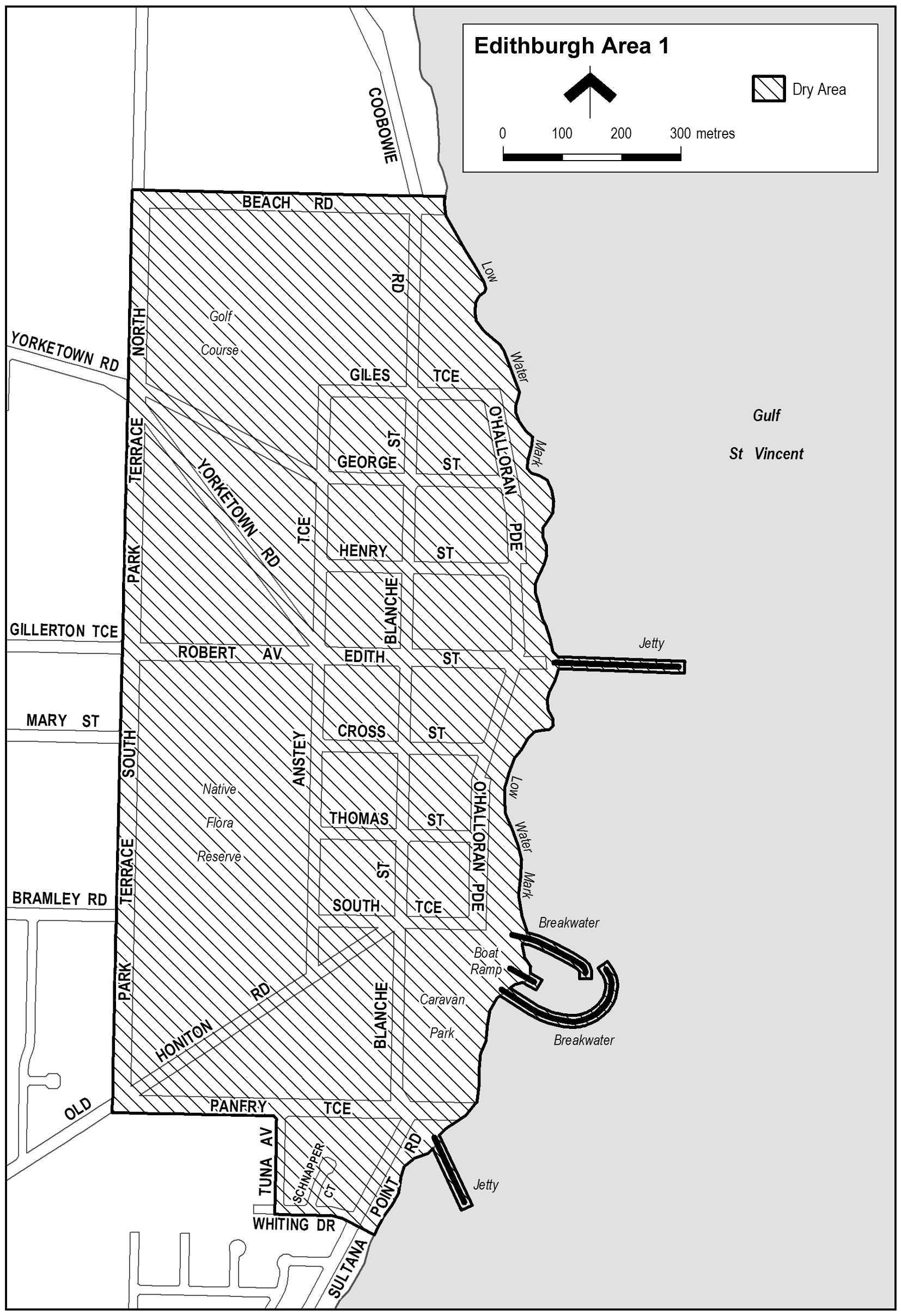 The area in and adjacent to Edithburgh bounded as follows: commencing at the point at which the prolongation in a straight line of the northern boundary of Beach Road intersects the low water mark on the western side of Gulf St Vincent, then generally south-easterly, southerly and south-westerly along the low water mark (including around the outer boundary of any groyne, breakwater, jetty, boat ramp or other structure extending out to sea so as to include in the area the whole of that structure and any area beneath it) to the point at which the low water mark is intersected by the prolongation in a straight line of the southern boundary of Whiting Drive, then north-westerly and westerly along that prolongation and boundary of Whiting Drive to the point at which it is intersected by the prolongation in a straight line of the western boundary of Tuna Avenue, then northerly along that prolongation and boundary of Tuna Avenue to the southern boundary of Panfry Terrace, then westerly along that boundary of Panfry Terrace and the prolongation in a straight line of that boundary to the point at which it intersects the prolongation in a straight line of the western boundary of Park Terrace South, then northerly along that prolongation and boundary of Park Terrace South and the western boundary of Park Terrace North to the point at which the western boundary of Park Terrace North intersects the prolongation in a straight line of the northern boundary of Beach Road, then easterly along that prolongation and boundary of Beach Road and the prolongation in a straight line of that boundary to the point of commencement.