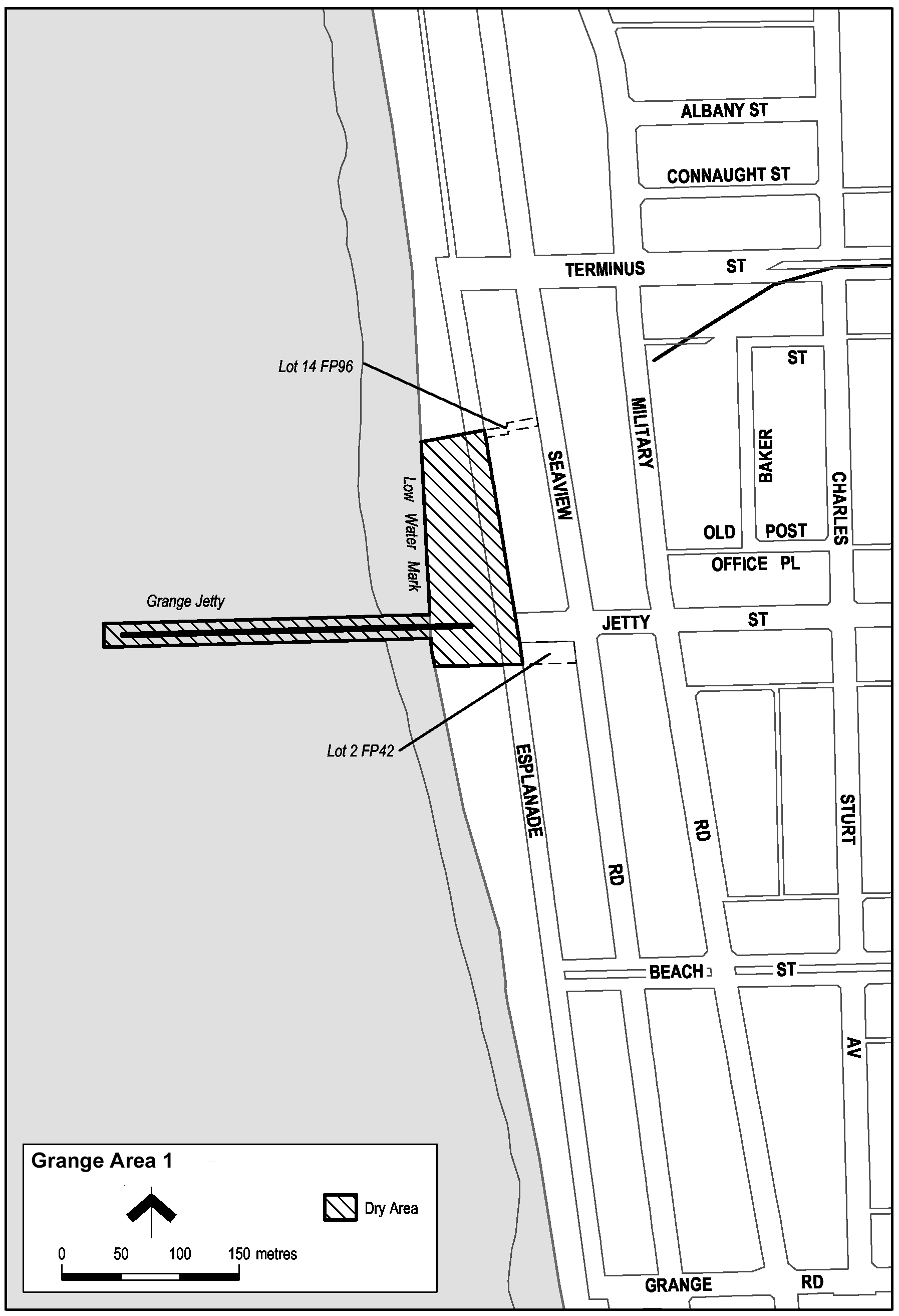 The area at Grange bounded as follows: commencing at the point at which the southern boundary of Lot 2 of Filed Plan No. 42, Hundred of Yatala, meets the eastern boundary of the Esplanade, then westerly along the prolongation in a straight line of that boundary of Lot 2 FP 42 to the low water mark, then northerly along the low water mark to the southern side of the Grange jetty, then westerly, northerly and easterly around the outer boundary of the jetty (so as to include all parts of the jetty and any area beneath the jetty) back to the low water mark on the northern side of the jetty, then northerly along the low water mark to its intersection with the westerly prolongation in a straight line of the northern boundary of Lot 14 of Filed Plan No. 96, Hundred of Yatala, then easterly along that prolongation to the point at which the northern boundary of Lot 14 meets the eastern boundary of the Esplanade, then southerly along that eastern boundary of the Esplanade to the point of commencement.