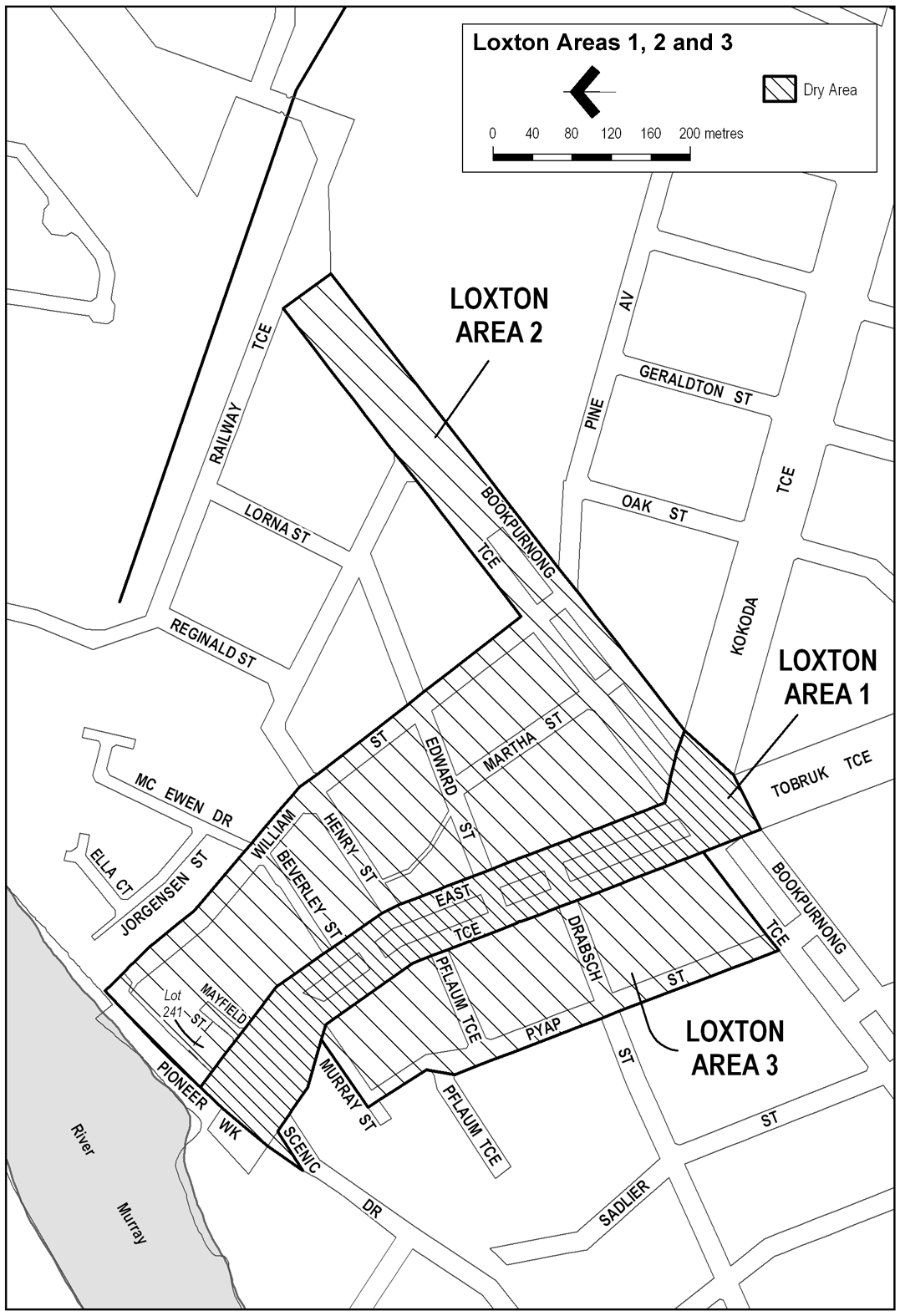 The area in Loxton, comprising East Terrace and additional land, as follows: commencing at the point at which the north-western boundary of Pioneer Walk intersects the prolongation in a straight line of the south-western boundary of Lot 241 of Filed Plan No. 178257, then south-easterly along that prolongation and boundary of Lot 241 and the north-eastern boundary of East Terrace to the point at which the north-eastern boundary of East Terrace meets the north-western boundary of Bookpurnong Terrace, then in a straight line by the shortest route to the point at which the south-eastern boundary of Bookpurnong Terrace meets the north-eastern boundary of Kokoda Terrace, then in a straight line by the shortest route to the point at which the south-western boundary of Kokoda Terrace meets the north-eastern boundary of Tobruk Terrace, then in a straight line by the shortest route to the point at which the south-western boundary of Tobruk Terrace meets the south-eastern boundary of Bookpurnong Terrace, then in a straight line by the shortest route to the point at which the north-western boundary of Bookpurnong Terrace meets the south-western boundary of East Terrace, then north-westerly along that boundary of East Terrace to the north-western boundary of Scenic Drive, then south-westerly along that boundary of Scenic Drive to the point at which it meets the north-western boundary of Pioneer Walk, then north-easterly along that boundary of Pioneer Walk to the point of commencement.