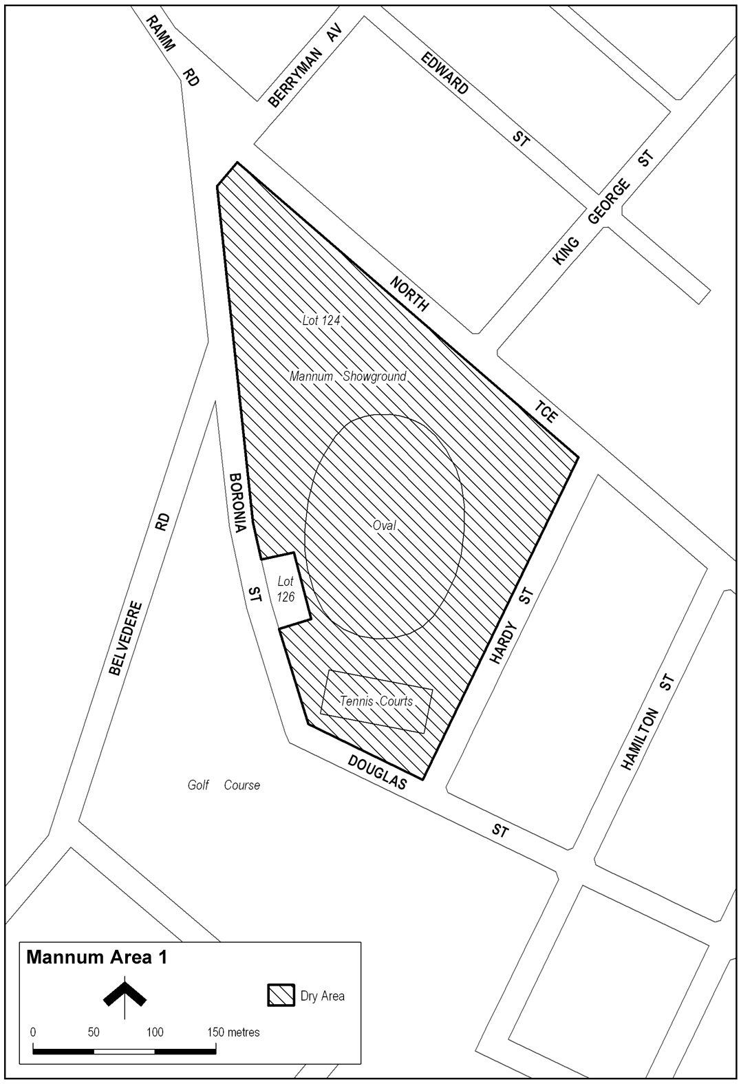 The area in Mannum known as the Mannum Showground (Lot 124 North Terrace, Mannum), being the area bounded on the north-east by North Terrace, on the north-west, west and south-west by Boronia Street and Douglas Street and on the south-east by Hardy Street (but excluding the area owned by the Mannum Football Club Inc (Lot 126 Boronia Street, Mannum)).