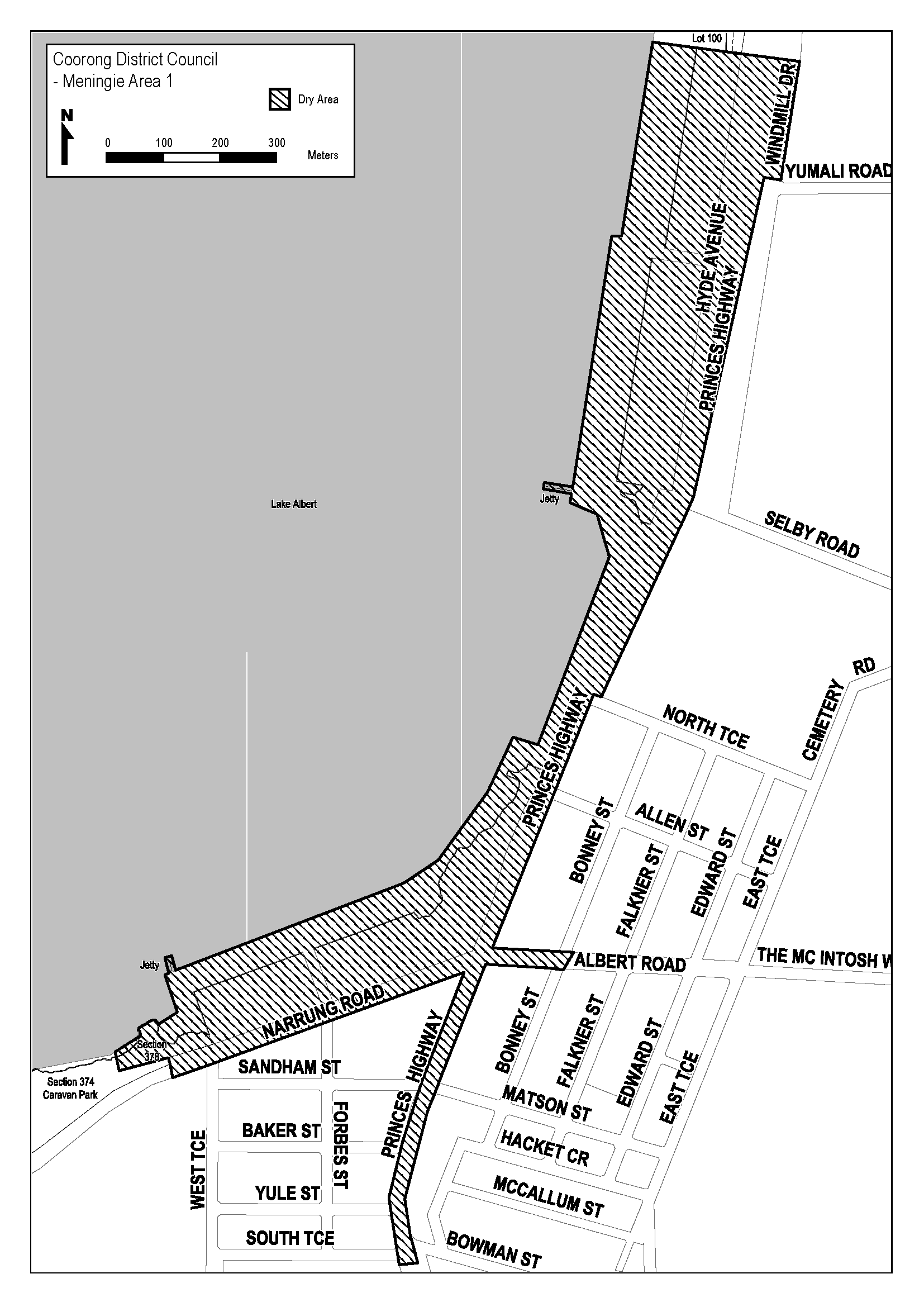 The area in Meningie bounded as follows: commencing at the point at which the prolongation in a straight line (across Princes Highway) of the southern boundary of Lot 100 DP 56693 (Motel) intersects the eastern boundary of Windmill Drive, then south-westerly along that boundary of Windmill Drive to the northern boundary of Yumali Road, then westerly along that boundary to the eastern boundary of Princes Highway, then generally south-westerly along that boundary of Princes Highway to the northern boundary of Albert Road, then easterly along that boundary of Albert Road, to the eastern boundary of Bonney Street, then in a straight line by the shortest route (across Albert Road) to the point at which the eastern boundary of Bonney Street intersects the southern boundary of Albert Road, then westerly along that boundary back to the eastern boundary of Princes Highway, then south-westerly along that boundary of Princes Highway to its intersection with the prolongation in a straight line (across Princes Highway) of the southern boundary of South Terrace, then in a straight line by the shortest route (across Princes Highway) to the point at which the southern boundary of South Terrace intersects the western boundary of Princes Highway, then north-easterly along that boundary of Princes Highway to the point at which it meets the southern boundary of Narrung Road, then south-westerly along that boundary of Narrung Road to its intersection with the prolongation in a straight line (across Narrung Road) of the eastern boundary of Section 374, Hundred of Bonney, (Caravan Park), then in a straight line by the shortest route (across Narrung Road) to the point at which it meets the northern boundary of Narrung Road, then north-westerly along that prolongation and boundary of Section 374 to the southern boundary of Section 378, Hundred of Bonney, then south-westerly and north-westerly along the southern and western boundaries of Section 378 and the prolongation in a straight line of the western boundary of that Section to the low water mark on the eastern shore of Lake Albert, then generally north-easterly along the low water mark of Lake Albert to the point at which it intersects the prolongation in a straight line of the southern boundary of Lot 100 DP 56693 (Motel), then south-easterly along that prolongation and boundary of Lot 100 and the prolongation in a straight line of that boundary (across Princes Highway) to the point of commencement. The area includes any jetty, wharf or other structure projecting into Lake Albert from the area described above, as well as any area beneath such a structure.