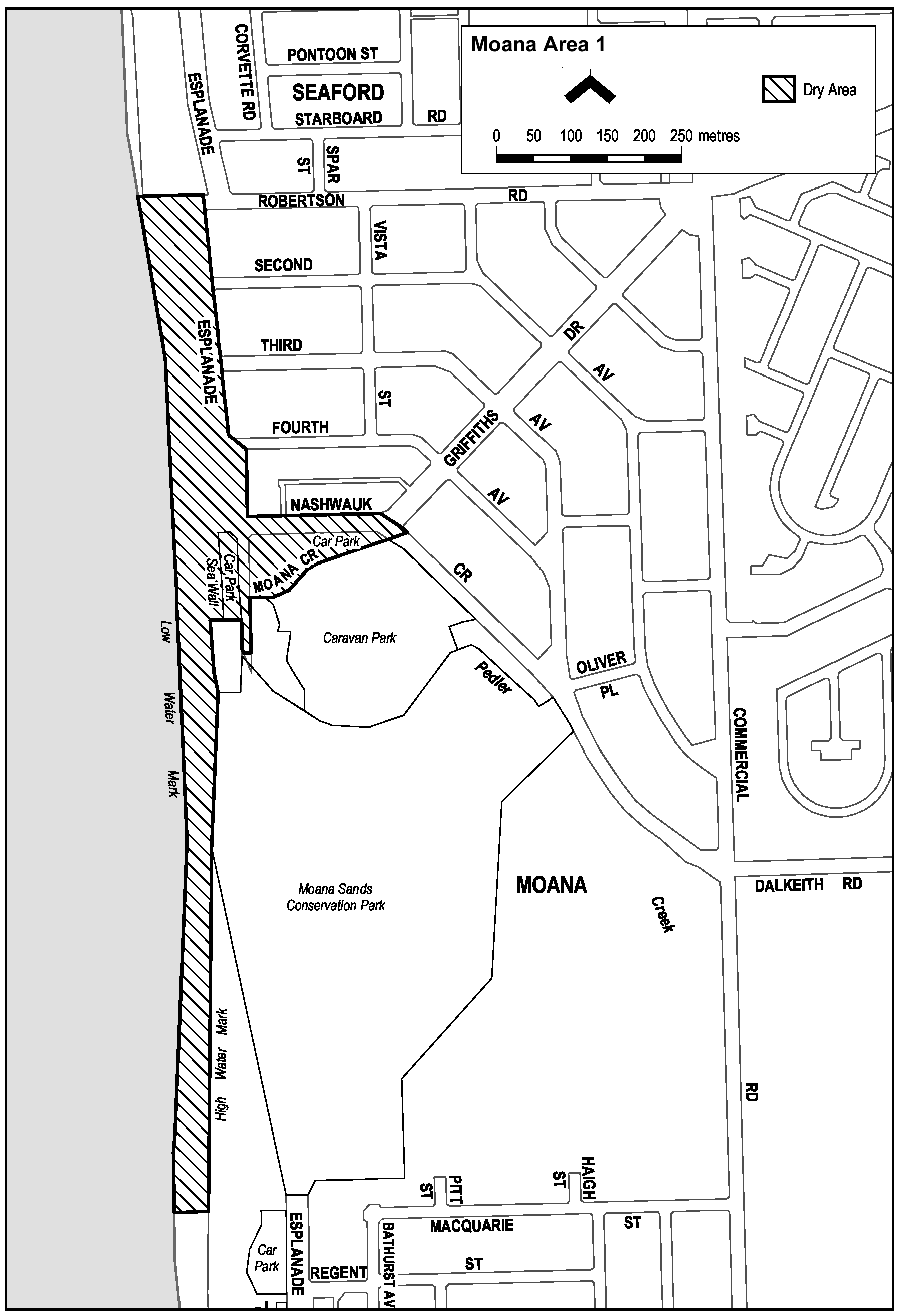 Commencing at the point at which the northern boundary of Robertson Road intersects the eastern boundary of the Esplanade, then southerly along the eastern boundary of the Esplanade to its intersection with the northern boundary of Nashwauk Crescent, then easterly along that northern boundary of Nashwauk Crescent to the point at which it meets the eastern boundary of Griffiths Drive, then in a straight line by the shortest route across Nashwauk Crescent to the southern boundary of the car park and reserve area opposite the southern end of Griffiths Drive, then generally south-westerly and westerly along that boundary of the car park and reserve area and the southern boundary of Moana Crescent to the eastern boundary of the Esplanade, then southerly along that eastern boundary of the Esplanade to the southern boundary of the Esplanade, then westerly along the southern boundary to the western boundary of the Esplanade, then northerly along the western boundary to the southern boundary of the car park, then westerly along the southern boundary of the car park to the sea-wall that forms the western boundary of the car park, then in a straight line by the shortest route to the high water mark, then generally southerly along the high water mark to its intersection with a fence extending from high to low water mark at a point approximately in line with the westerly prolongation of Macquarie Street, then westerly along that fence to low water mark, then generally northerly along low water mark to its intersection with the prolongation in a straight line of the northern boundary of Robertson Road, then easterly along that prolongation to the point of commencement.