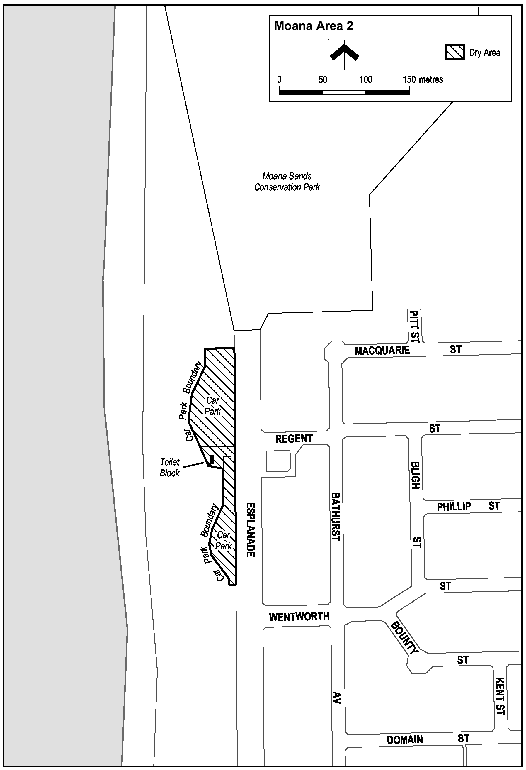 The part of Section 589, Hundred of Willunga, west of the portion of the Esplanade that lies between the Moana Sands Conservation Park and Wentworth Street, that is constructed as car parks, together with the toilet block situated between the car parks.