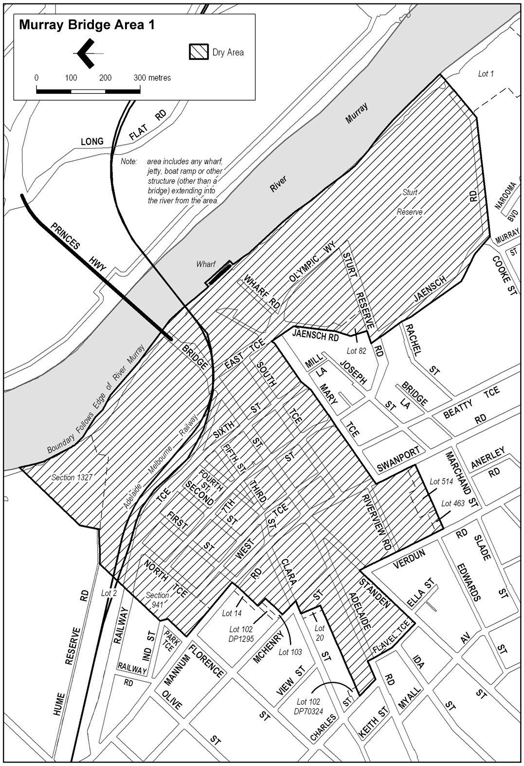 The area in Murray Bridge bounded as follows: commencing at the point at which the south-eastern boundary of Bridge Street meets the south-western edge of the River Murray, then generally south-easterly along that edge of the River to the point at which it intersects the prolongation in a straight line of the south-eastern boundary of the southern portion of Jaensch Road, then generally south-westerly, westerly and north-westerly along that prolongation and boundary of the southern portion of Jaensch Road and the prolongation in a straight line across Sturt Reserve Road of that boundary to the north-western boundary of Sturt Reserve Road, then north-easterly along that boundary of Sturt Reserve Road to the western boundary of Lot 82 DP 55455, then generally north-westerly and north-easterly along that boundary of Lot 82 to the western boundary of the northern portion of Jaensch Road, then generally north-easterly and north-westerly along that boundary of the northern portion of Jaensch Road to the point at which it meets the south-eastern boundary of Mary Terrace, then in a straight line by the shortest route to the point at which the south-western boundary of East Terrace meets the north-western boundary of Mary Terrace, then south-westerly along that boundary of Mary Terrace and the prolongation in a straight line of that boundary to the south-western boundary of Swanport Road, then south-easterly along that boundary of Swanport Road to the south-eastern boundary of Lot 514 FP 167329, then south-westerly along that boundary of Lot 514 and the south-eastern boundary of Lot 463 FP 167278 to the north-eastern boundary of Verdun Road, then north-westerly along that boundary of Verdun Road and the prolongation in a straight line of that boundary to the north-western boundary of Standen Street, then south-westerly along that boundary of Standen Street to the north-eastern boundary of Flavel Terrace, then generally north-westerly along that boundary of Flavel Terrace and the prolongation in a straight line of that boundary to the north-western boundary of Adelaide Road, then south-westerly along that boundary of Adelaide Road to the north-eastern boundary of Charles Street, then north-westerly along that boundary of Charles Street to the south-eastern boundary of Lot 102 DP 70324, then north-easterly in a straight line along the south-eastern boundary of that Lot and of the adjoining Lots to the north-eastern boundary of Lot 20 FP 27435, then north-westerly along the north-eastern boundary of Lot 20 to the south-eastern boundary of Clara Street, then north-easterly along that boundary of Clara Street to the north-eastern boundary of McHenry Street, then north-westerly along that boundary of McHenry Street to the south-eastern boundary of Lot 103 DP 1295, then north-easterly along that boundary of Lot 103 to the north-eastern boundary of the Lot, then north-westerly along the north-eastern boundary of Lot 103 and of Lot 102 DP 1295 to the south-eastern boundary of Lot 14 DP 1295, then north-easterly along the south-eastern boundary of Lot 14 and the prolongation in a straight line of that boundary to the north-eastern boundary of Mannum Road, then north-westerly along that boundary of Mannum Road to the north-western boundary of Section 941, Hundred of Mobilong (the south-eastern boundary of Park Terrace), then north-easterly, north-westerly and north-easterly along that north-western boundary of Section 941 and the prolongation in a straight line of that boundary to the northern boundary of Lot 2 DP 40450 (the southern boundary of Hume Reserve Road), then generally easterly along that boundary of Lot 2 to the western boundary of Section 1327 Hundred of Mobilong, then northerly and north-easterly along that boundary of Section 1327 and the prolongation in a straight line of that boundary to the south-western edge of the River Murray, then generally south-easterly along that edge of the River to the point of commencement. The area includes any wharf, jetty, boat ramp or other structure (other than a bridge across the River) extending into or over the River from the area described above.