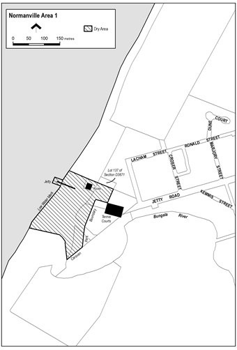 Commencing at the point at which the southern side of the Normanville jetty intersects with the low water mark, then generally south-westerly along the low water mark to the mouth of the Bungala River, then along the northern bank of the river to its intersection with the western boundary of the caravan park, then generally north-easterly, northerly and easterly along the western and northern boundaries of the caravan park to the point at which the northern boundary joins the northern boundary of the tennis courts, then in a straight line by the shortest route to the south-eastern corner of Lot 137 of part Section 1014, Hundred of Yankalilla, then north-westerly along the southern boundary of that lot and the prolongation in a straight line of the southern boundary of that lot to the low water mark, then generally south-westerly along the low water mark to the northern side of the Normanville jetty, then north-westerly, south-westerly and south-easterly along the northern, western and southern sides of the Normanville jetty to the point of commencement.