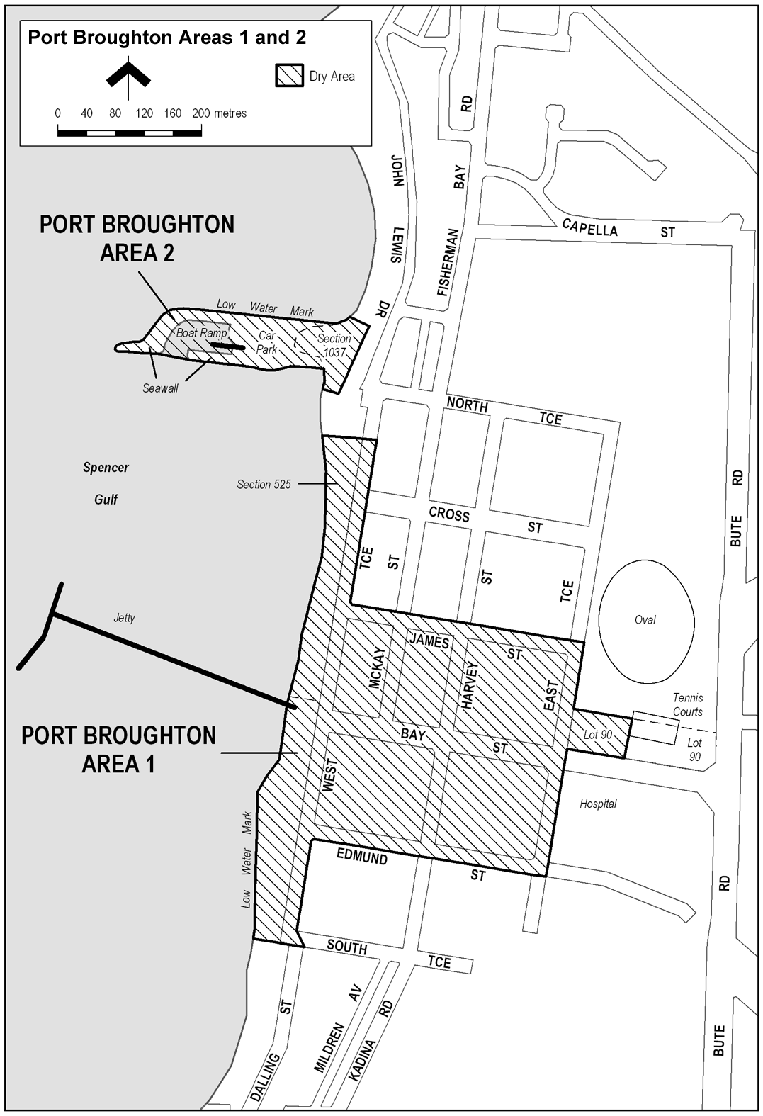 The area in Port Broughton bounded as follows: commencing at the point at which the prolongation in a straight line of the southern boundary of South Terrace intersects the low water mark of Spencer Gulf, then generally northerly along the low water mark to the point at which it is intersected by the prolongation in a straight line of the northern boundary of Section 525 Hundred of Mundoora, then easterly along that prolongation and boundary of Section 525 and the prolongation in a straight line of that boundary to the eastern boundary of West Terrace, then southerly along that boundary of West Terrace to the northern boundary of James Street, then easterly along the northern boundary of James Street and the prolongation in a straight line of that boundary to the eastern boundary of East Terrace, then southerly along that boundary of East Terrace to the northern boundary of Lot 90 T 210602, then easterly along that boundary of Lot 90 to the point at which it is intersected by the line of the western fence of the tennis courts on Lot 90, then southerly along that line of the western fence of the tennis courts to the point at which the line intersects the northern boundary of Bay Street, then westerly along that boundary of Bay Street to the eastern boundary of East Terrace, then southerly along that boundary of East Terrace to the southern boundary of Edmund Street, then westerly along that boundary of Edmund Street to the eastern boundary of West Terrace, then southerly along that boundary of West Terrace to the northern boundary of South Terrace, then in a straight line by the shortest route to the point at which the southern boundary of South Terrace meets the eastern boundary of Dalling Street, then westerly along the prolongation in a straight line of the southern boundary of South Terrace to the point of commencement.