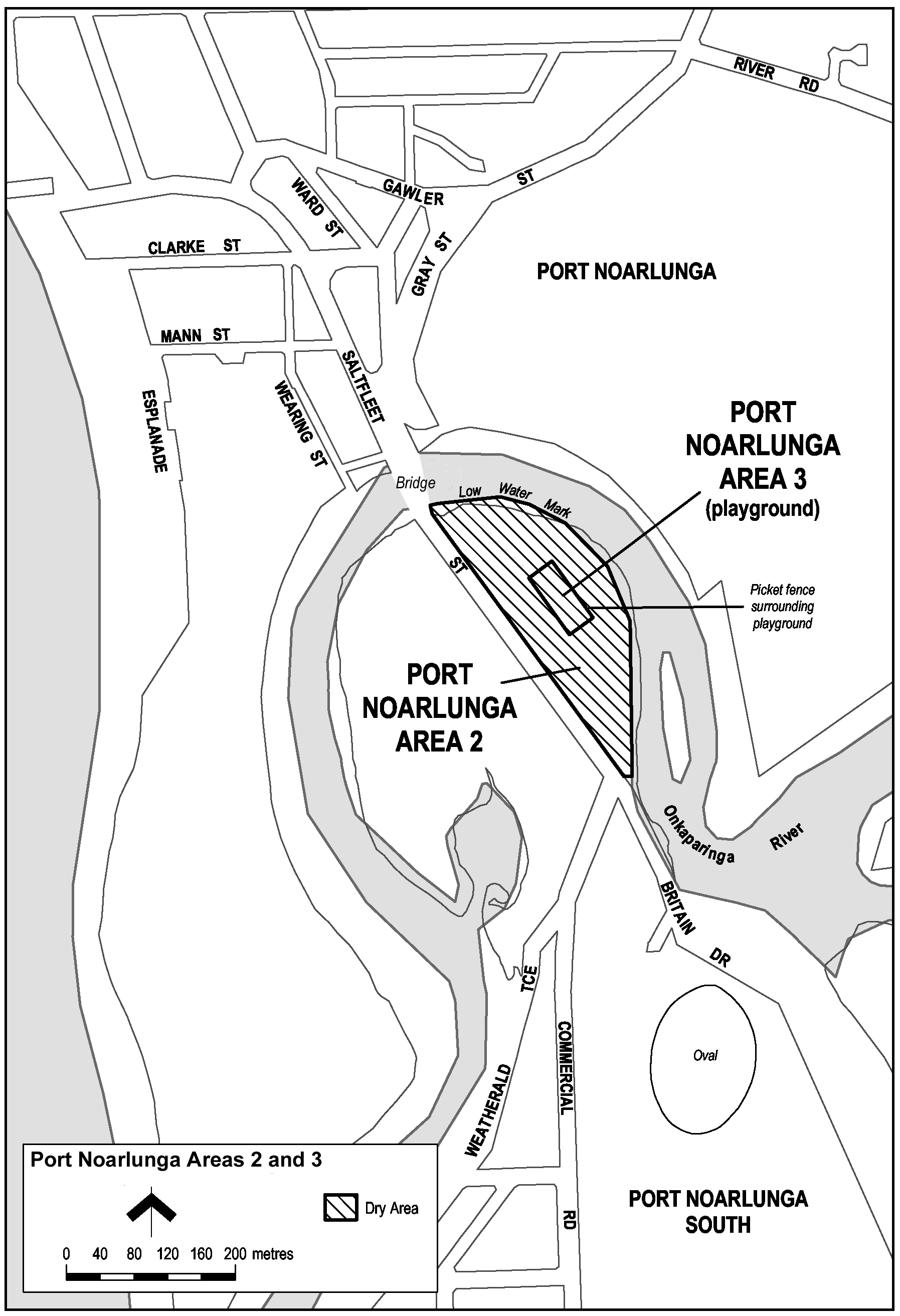 The area at Port Noarlunga known as the Jubilee Park Reserve (together with adjacent land) bounded as follows: commencing at the point at which the low water mark on the southern side of the Onkaparinga River intersects the eastern side of the Saltfleet Street Bridge, then generally south-easterly along that side of the Bridge and along the eastern boundary of Saltfleet Street to the point at which the eastern boundary of Saltfleet Street meets the northern boundary of Britain Drive, then easterly in a straight line to the low water mark on the western side of the Onkaparinga River, then generally northerly and westerly along the low water mark on that side of the Onkaparinga River to the point of commencement, but excluding the Jubilee Park Reserve Adventure Playground (as defined in Port Noarlunga Area 3).