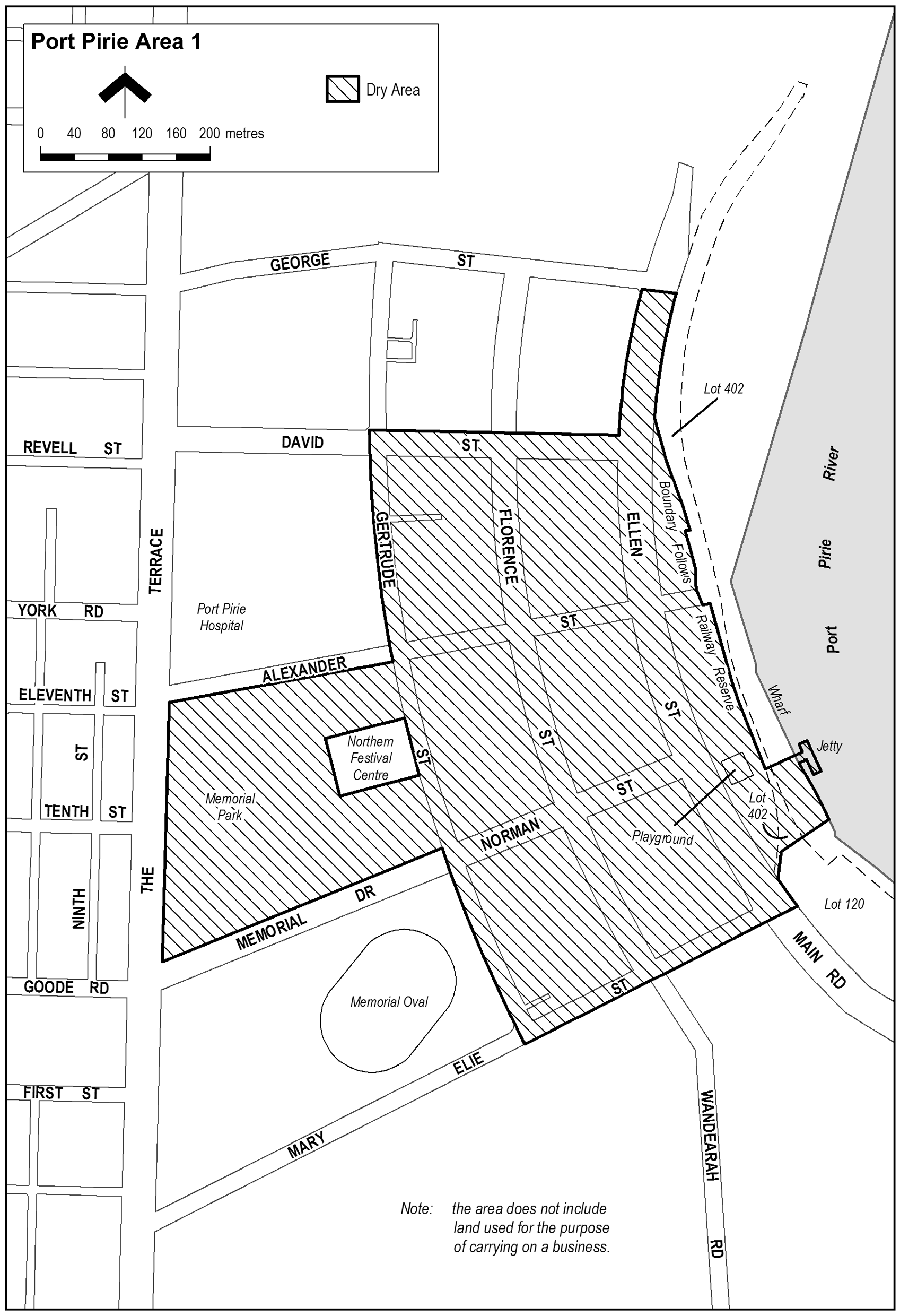 The area in Port Pirie bounded as follows: commencing at the point at which the prolongation in a straight line of the south-eastern boundary of Mary Elie Street intersects the western boundary of Lot 120 DP 53026 (the north-eastern boundary of Main Road), then north-westerly, northerly and north-easterly along the boundary of Lot 120 to the point at which it meets the eastern boundary of Lot 402 DP 75081 (a Railway Reserve), then in a straight line by the shortest route to the eastern edge of the wharf on the western side of the Port Pirie River, then north-westerly along that edge of the wharf to the point at which it meets the southern side of a T-shaped jetty projecting from the wharf into the River (at a point immediately to the east of a fenced playground in Flinders View Park), then around the outer boundary of the jetty back to the wharf on the northern side of the jetty (so as to include the whole of the jetty in the area), then in a straight line by the shortest route to the western boundary of Lot 402 DP 75081(the Railway Reserve), then generally north-westerly and northerly along that western boundary of Lot 402 to the point at which it is intersected by the prolongation in a straight line of the southern boundary of George Street, then westerly along that prolongation of the southern boundary of George Street to the western boundary of Ellen Street, then southerly along that boundary of Ellen Street to the northern boundary of David Street, then westerly along that boundary of David Street to the point at which it intersects the western boundary of Gertrude Street, then southerly along that boundary of Gertrude Street to the point at which it intersects the southern boundary of Alexander Street, then south-westerly along that boundary of Alexander Street to the eastern boundary of The Terrace, then southerly along that boundary of The Terrace to the northern boundary of Memorial Drive, then north-easterly along that boundary of Memorial Drive to the point at which it meets the western boundary of Gertrude Street, then south-easterly along that boundary of Gertrude Street and the prolongation in a straight line of that boundary to the point at which it intersects the south-eastern boundary of Mary Elie Street, then north-easterly along that boundary of Mary Elie Street and the prolongation in a straight line of that boundary to the point of commencement. The area includes any area beneath a wharf or jetty included in the area, but excludes the Northern Festival Centre (Section 1285 Hundred of Pirie) and any land used for the purpose of carrying on a business.