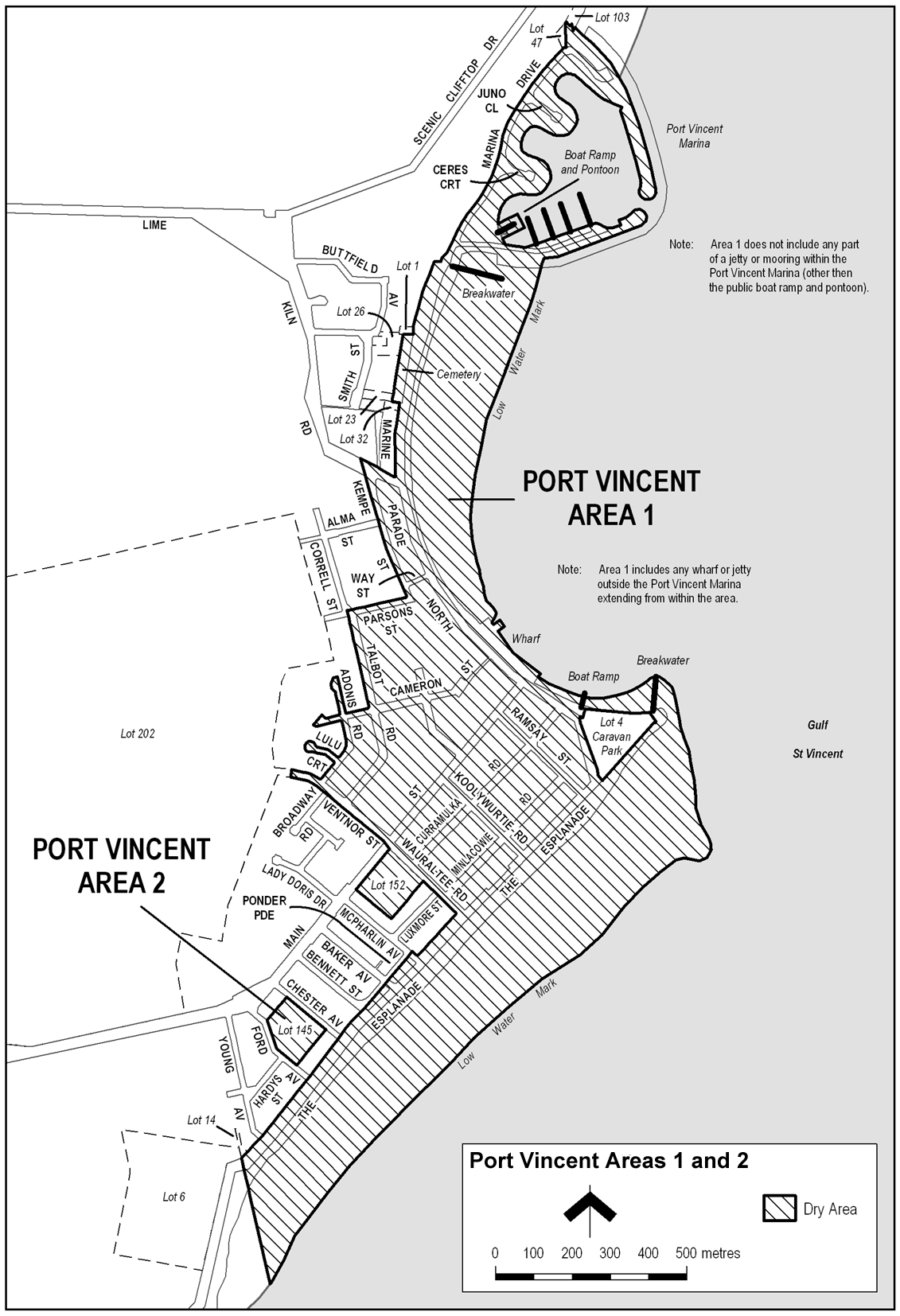 The area in Port Vincent bounded as follows: commencing at the point at which the eastern boundary of Lot 47 DP 61751 meets the western boundary of Marina Drive, then generally south-westerly along that boundary of Marina Drive and of Marine Parade North to the point at which the western boundary of Marine Parade North meets the southern boundary of Lot 1 FP 128918, then westerly along the southern boundary of Lot 1 to the eastern boundary of Lot 26 FP 3593, then southerly along that eastern boundary of Lot 26 and of the adjoining Lots to the northern boundary of Lot 32 FP 17100, then easterly along that northern boundary of Lot 32 to the western boundary of Marine Parade North, then southerly along that boundary of Marine Parade North to the north-eastern boundary of Lime Kiln Road, then north-westerly along that boundary of Lime Kiln Road to the point at which it intersects the prolongation in a straight line of the western boundary of Kempe Street, then south-easterly along that prolongation and boundary of Kempe Street to the northern boundary of Parsons Street, then south-westerly along that boundary of Parsons Street to its intersection with the prolongation in a straight line of the western boundary of Talbot Road, then south-easterly along that prolongation and boundary of Talbot Road to the northern boundary of Cameron Street, then south-westerly along that boundary of Cameron Street to the eastern boundary of Adonis Road, then generally north-westerly, westerly and south-easterly around the boundary of Adonis Road back to the northern boundary of Cameron Street, then generally south-westerly, southerly and north-easterly around the boundary of Cameron Street back to the western boundary of Adonis Road, then south-easterly and south-westerly along that boundary of Adonis Road to the northern boundary of Lulu Court, then generally north-westerly, southerly and south-easterly around the boundary of Lulu Court back to the western boundary of Adonis Road, then south-westerly along that boundary of Adonis Road to the northern boundary of Ventnor Street, then generally westerly to the western end of Ventnor Street (the point at which it meets the eastern boundary of Lot 202 DP 62958), then southerly, easterly and south-easterly along the western and south-western boundaries of Ventnor Street to the north-western boundary of Main Street, then in a straight line by the shortest route across Main Street to the northern corner of Lot 152 DP 6070 (Bennett Park), then south-westerly, south-easterly and north-easterly along the north-western, south-western and south-eastern boundaries of Lot 152 to the south-western boundary of Wauraltee Road, then south-easterly along that boundary of Wauraltee Road to the north-western boundary of The Esplanade, then south-westerly along that boundary of The Esplanade to the north-eastern boundary of McPharlin Avenue, then north-westerly along that boundary of McPharlin Avenue to its intersection with the prolongation in a straight line of the south-eastern boundary of Ponder Parade, then south-westerly along that prolongation and boundary of Ponder Parade to the south-western end of that boundary, then in a straight line by the shortest route to the point at which the south-western boundary of Bennett Street meets the north-western boundary of The Esplanade, then south-westerly along that boundary of The Esplanade to the point at which it meets the boundary between Lot 6 DP 40247 and Lot 14 DP 43811, then south-easterly along the prolongation in a straight line of that common boundary to the point at which it intersects the low water mark on the western side of Gulf St Vincent, then generally north-easterly, easterly, north-westerly, westerly, north-westerly, northerly and north-easterly along the low water mark to the southern side of the entrance to the Port Vincent Marina, then along the low water mark inside the marina back to the entrance on the northern side of the marina, then generally north-westerly along the low water mark on the outer side of the northern breakwater of the marina to the point at which the breakwater continues north-westerly inland above the low water mark, then north-westerly along the outer boundary of the breakwater as it continues north-westerly inland to the eastern boundary of Lot 103 DP 54608, then generally south-westerly, north-westerly, south-westerly and north-westerly along the eastern and southern boundaries of Lot 103 to the eastern boundary of Lot 47 DP 61751, then southerly along that boundary of Lot 47 to the point of commencement. The area includes the public boat ramp and pontoon inside the Port Vincent Marina and any wharf or jetty outside the marina extending from the area described above, but does not include the Port Vincent Caravan Park (Lot 4 DP 24058) or any part of a jetty or mooring (other than the public boat ramp and pontoon) inside the Port Vincent Marina.
