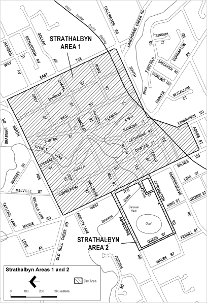 The area in Strathalbyn bounded as follows: commencing at the point at which the south-eastern boundary of North Parade meets the north-eastern boundary of West Terrace, then south-easterly along that boundary of West Terrace to the north-western boundary of Adams Street, then north-easterly along that boundary of Adams Street and the prolongation in a straight line of that boundary to the north-eastern boundary of Edinburgh Road, then north-westerly along that boundary of Edinburgh Road to the end of the road, then in a straight line by the shortest route to the point at which the south-eastern boundary of South Terrace meets the south-western boundary of Parker Avenue, then along the continuation of that straight line across South Terrace to the north-western boundary of South Terrace, then north-easterly along the north-western boundary of South Terrace to the south-western boundary of East Terrace, then north-westerly along the south-western boundary of East Terrace to the south-eastern boundary of North Parade, then south-westerly along the south-eastern boundary of North Parade to the point of commencement.
