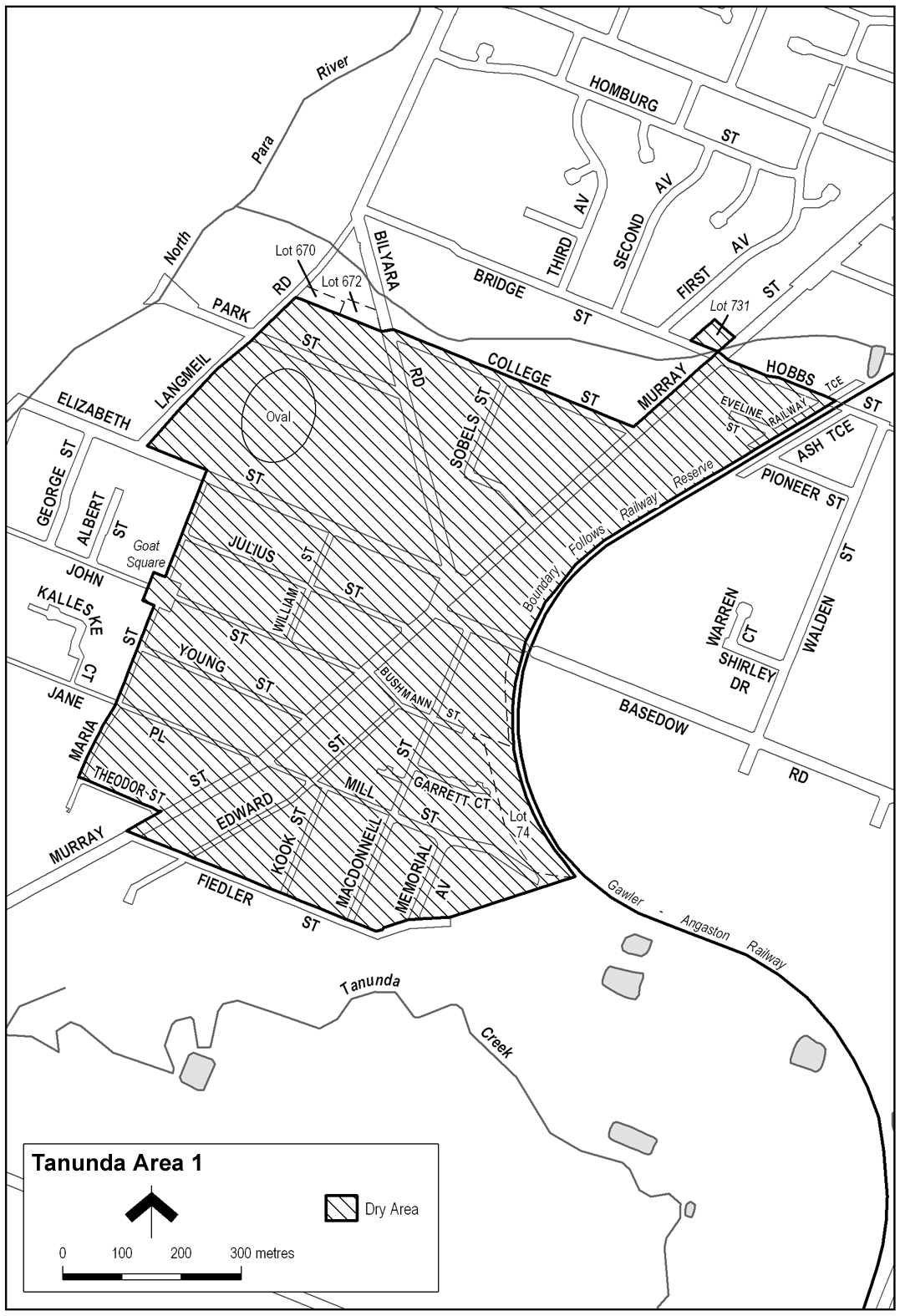The area in Tanunda bounded as follows: commencing at the point at which the northern boundary of College Street meets the western boundary of Murray Street, then north easterly along the western boundary of Murray Street to the southern boundary of Lot 731 FP 172182 (the northern boundary of Bridge Street), then north westerly, north easterly and south easterly along the southern, western and northern boundaries of Lot 731 back to the western boundary of Murray Street, then south westerly along that boundary of Murray Street to the point at which it meets the northern boundary of Bridge Street, then in a straight line by the shortest route across Murray Street to the point at which the eastern boundary of Murray Street meets the northern boundary of Hobbs Street, then generally south easterly along the northern boundary of Hobbs Street and the prolongation in a straight line of that boundary to the north western boundary of the railway reserve, then generally south westerly along that boundary of the railway reserve to the northern boundary of Basedow Road, then in a straight line by the shortest route across Basedow Road to the point at which the southern boundary of Basedow Road meets the western boundary of the railway reserve, then generally southerly and south easterly along the western boundary of the railway reserve to the point at which that boundary meets the southern boundary of Lot 74 DP 58229, then in a straight line by the shortest route to the northern boundary of the eastern end of Fiedler Street, then generally south westerly and north westerly along the northern boundary of Fiedler Street and the prolongation in a straight line of that boundary to the western boundary of Murray Street, then north easterly along the western boundary of Murray Street to the northern boundary of Theodor Street, then north westerly along the northern boundary of Theodor Street and the prolongation in a straight line of that boundary to the western boundary of Maria Street, then generally north easterly along the western boundary of Maria Street (including around the southern, western and northern boundaries of Goat Square, so as to include the whole of the Square within the area) and the prolongation in a straight line of that boundary to the northern boundary of Elizabeth Street, then north westerly along that boundary of Elizabeth Street to the eastern boundary of Langmeil Road, then north easterly along that boundary of Langmeil Road to the point at which it meets the southern boundary of Lot 670 FP 172121, then south easterly along that boundary of Lot 670 and the southern boundary of Lot 672 FP 172123 to the point at which that boundary of Lot 672 meets the western boundary of Bilyara Road, then in a straight line by the shortest route across Bilyara Road to the point at which the eastern boundary of Bilyara Road meets the northern boundary of College Street, then south easterly along the northern boundary of College Street to the point of commencement.